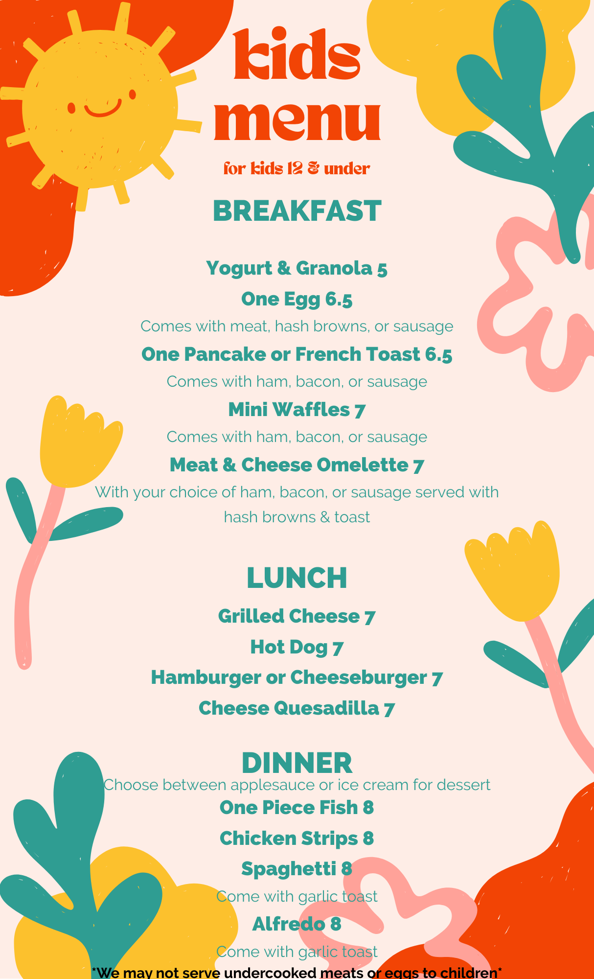 Restaurant menu divided into sections for Burgers, Sandwiches, Home-Style, Seafood, and Pasta with various dishes and prices listed.